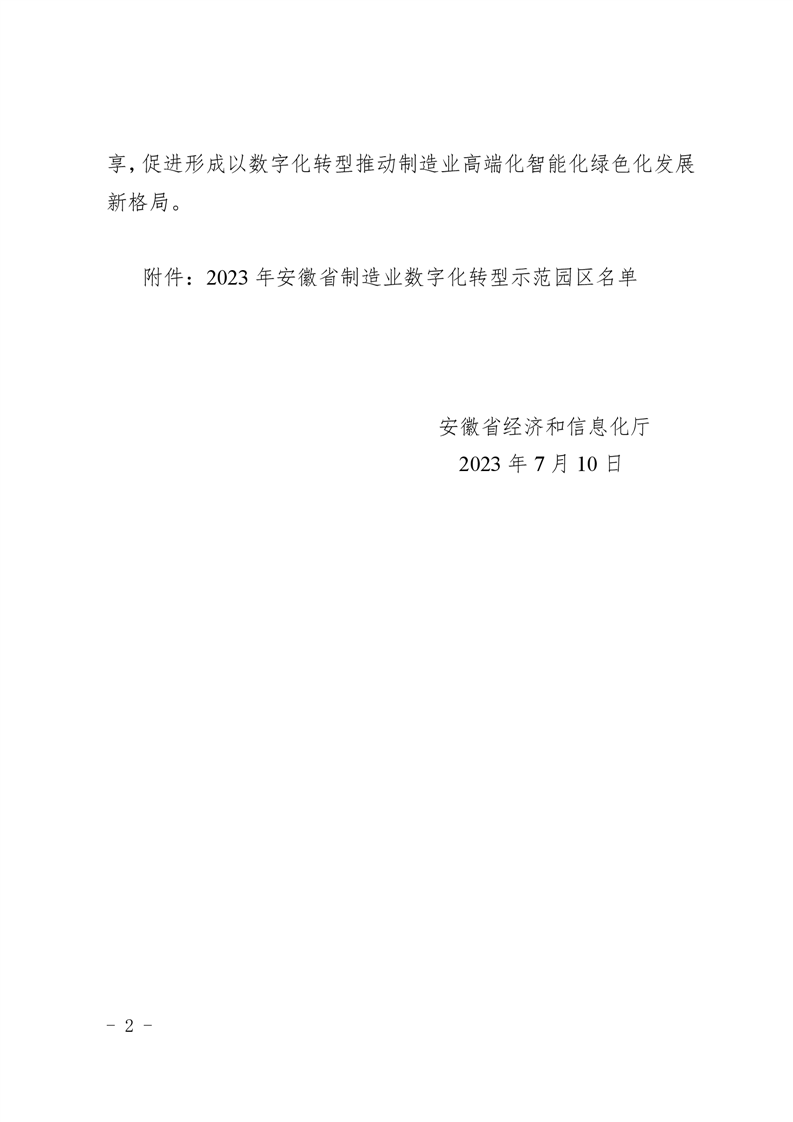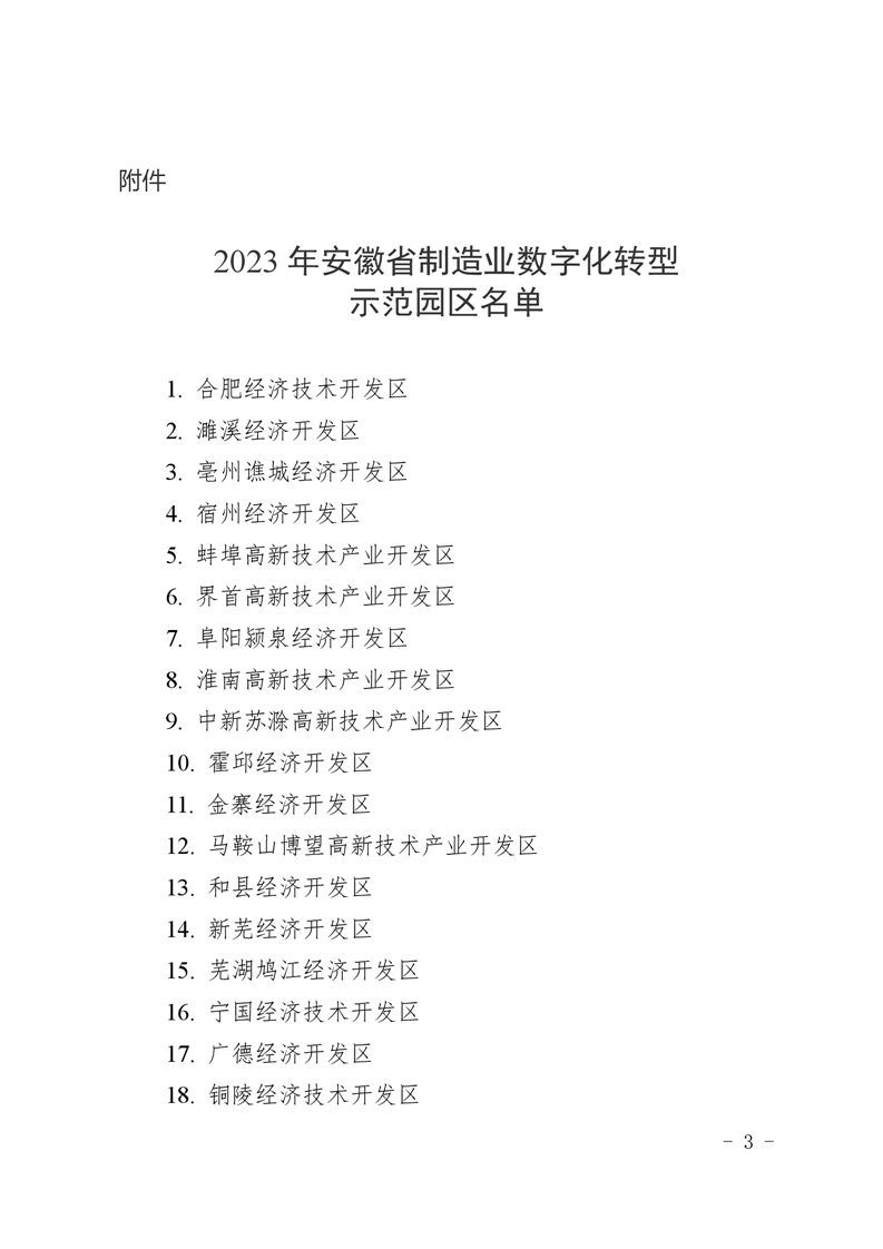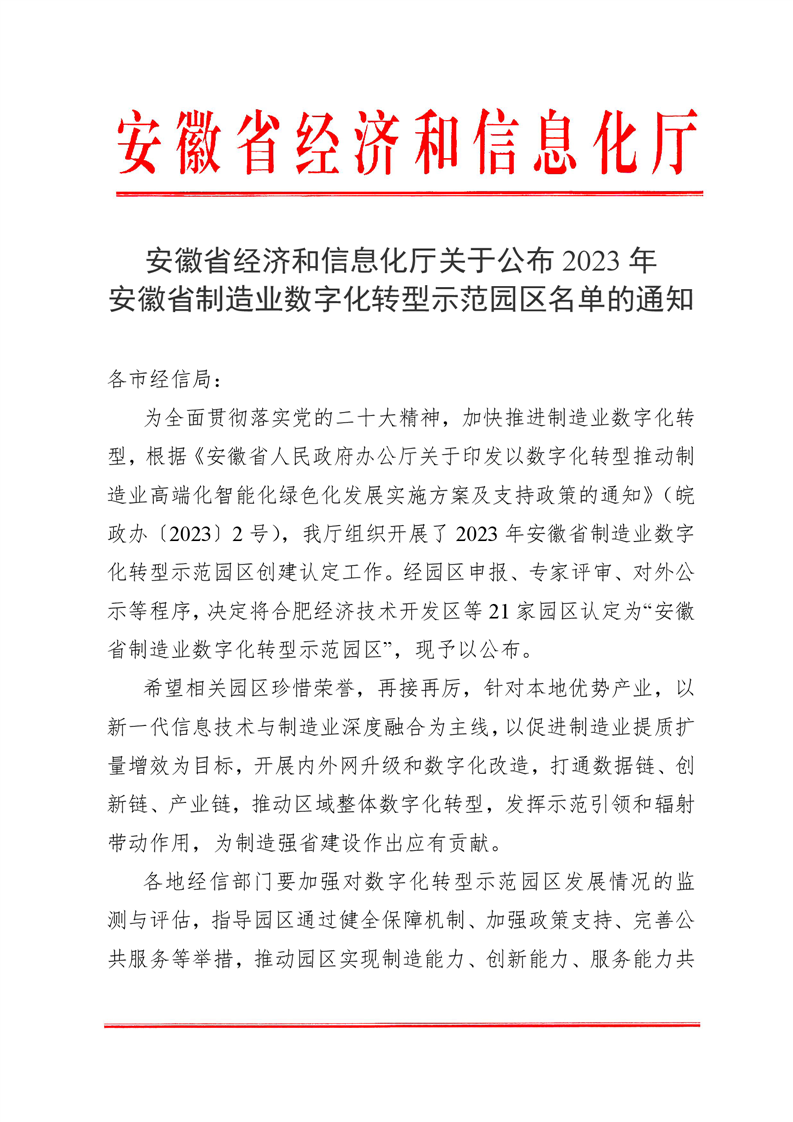 【“一区一业一样板”】安徽省经济和信息化厅关于公布2023年安徽省制造业数字化转型示范园区名单的通知 |