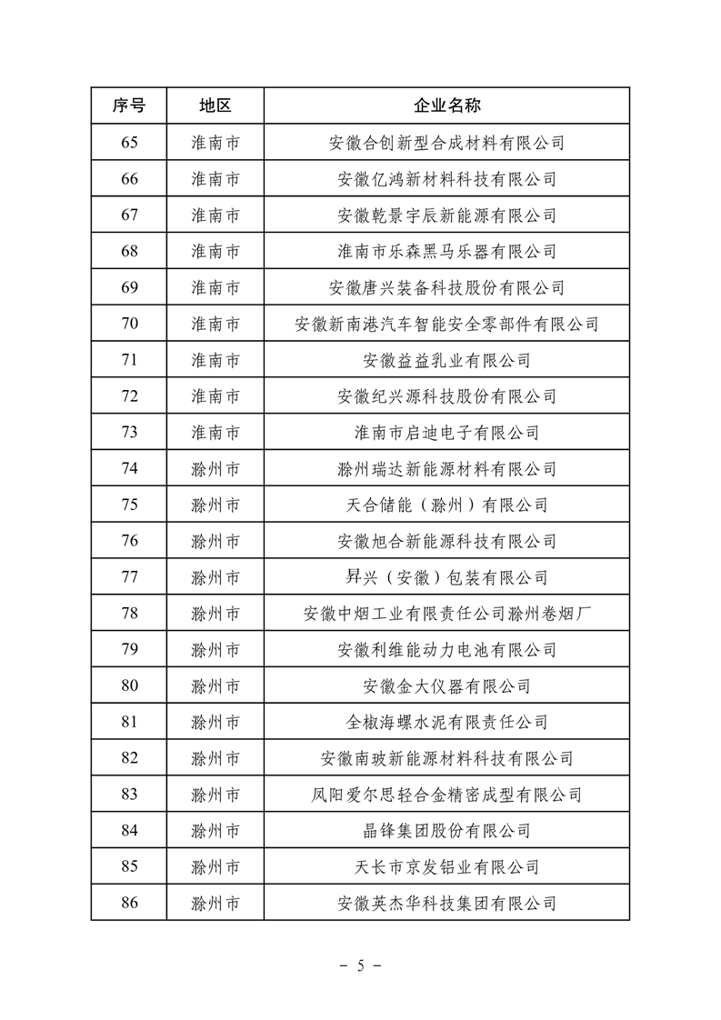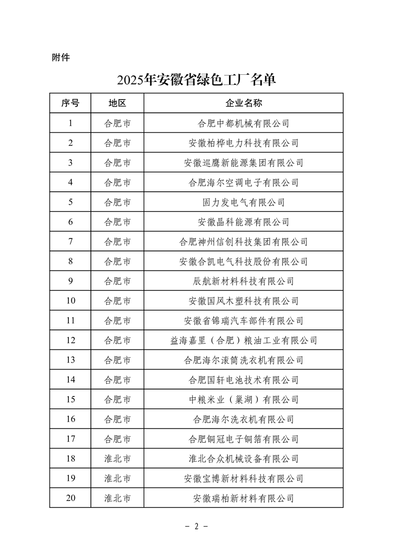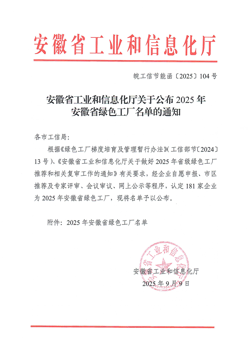 关于公布2025年安徽省绿色工厂名单的通知 |